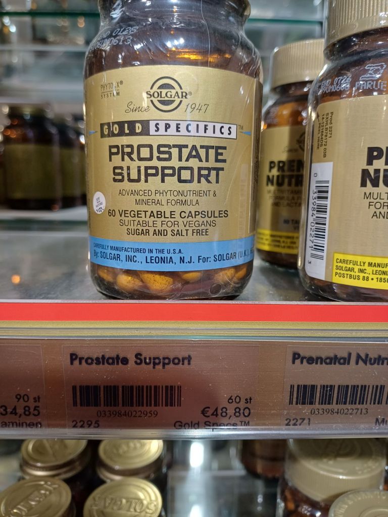 In photo 2, you see an expensive bottle of prostate pills “suitable for vegans”…